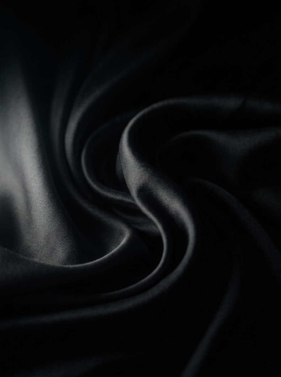 The dress is all fall and shadow. It collapses into itself and then opens again at the hem. It absorbs light rather than reflecting it. Wear it and you will understand why darkness can feel like protection — like the inside of a seed before the breaking, like the hour before the dream begins. It does not promise resolution. It promises presence.